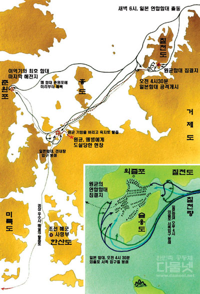 ¿ø±ÕÀÌ °£½ÅÈ÷ Çѻ굵·Î ÅëÇÏ´Â °ß³»·® ÀÔ±¸¿¡ µµÂøÇÏ°í º¸´Ï, ±× °÷¿¡µµ ¼ö¹é ôÀÇ ¿Ö¼±µéÀÌ ¼ö·Î¸¦ öÅë°°ÀÌ ºÀ¼âÇϰí ÀÖ¾ú´Ù.ÀÌ ¶§, Á¶¼±ÀÇ ±âÇÔÀ» ¹ß°ßÇÑ ¿Ö¼±µéÀÌ ÀÏÁ¦È÷ ´Þ·Áµé¾î ÁýÁß°ø°ÝÀ» ÆÛºÎÀ¸´Ï ±âÇÔÀº ¼ø½Ä°£¿¡ È¿°¿¡ ÈÛ½ÎÀ̸ç ħ¸ôÇϱ⠽ÃÀÛÇß´Ù.